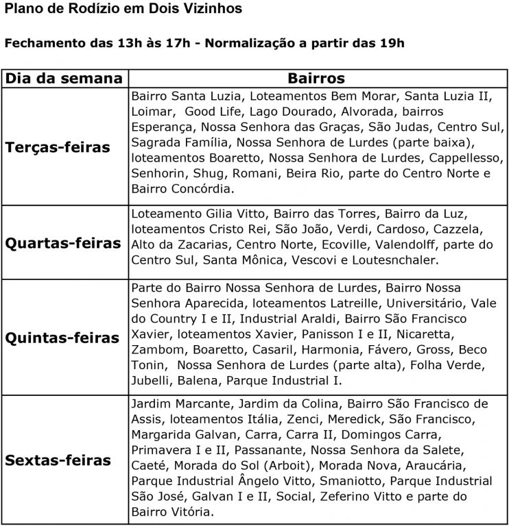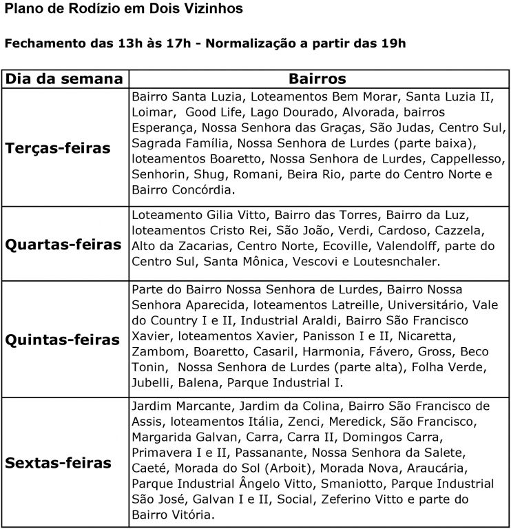 A Sanepar informa que vai manter o cronograma do rodízio no abastecimento de água de Dois Vizinhos por mais 15 dias. A medida continua sendo necessária para o período de 04 a 17/01 porque a estiagem severa diminuiu drasticamente a vazão dos poços e do Rio Girau Alto que abastecem os moradores da cidade, reduzindo em mais de 40% a captação e a produção de água tratada. Mesmo com as medidas operacionais adotadas, não há água disponível para atender a demanda da cidade, que teve aumento de 15% no mês passado.