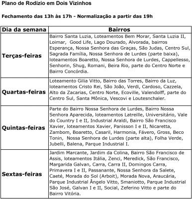 A programação do rodízio permanece inalterada. O fechamento, inicialmente, será das 13h às 17h, com previsão de normalização gradativa a partir das 19h. Dependendo do comportamento do sistema, esse horário poderá ser ampliado ou reduzido.