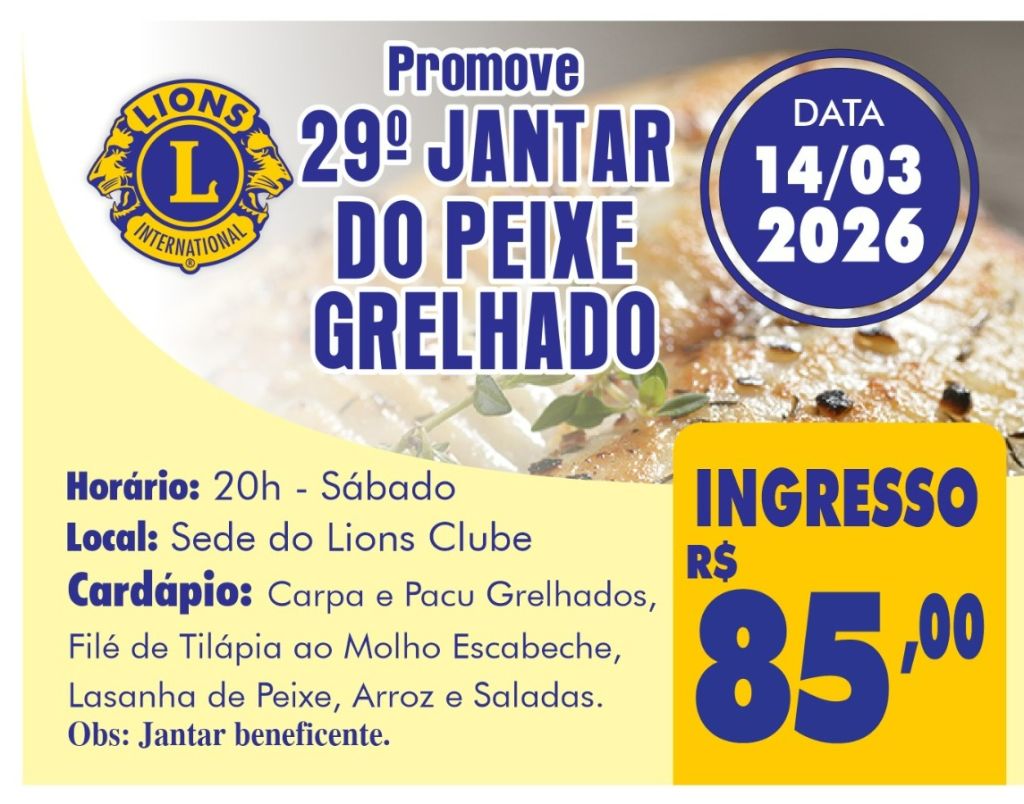 O Lions Clube de Dois Vizinhos prepara mais uma edição de seu tradicional evento beneficente: o 29º Jantar do Peixe Grelhado, que acontece no dia 14 de março de 2026 (sábado), a partir das 20h, na sede da entidade.