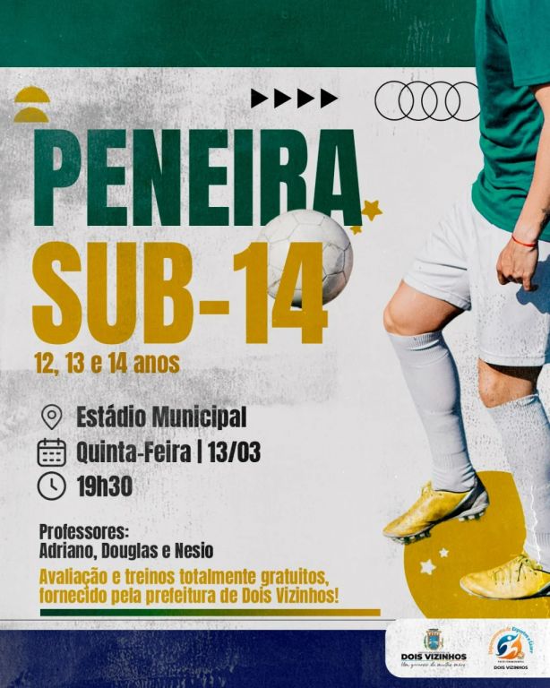 A Secretaria de Esportes e Lazer do município está organizando uma triagem de futebol gratuita, uma oportunidade para atletas da categoria Sub-14 (12, 13 e 14 anos) mostrarem seu talento. O evento acontece nesta quinta-feira, 13, às 19h30, no Estádio Municipal Frederico Galvan, e será coordenado pelos professores Adriano, Douglas e Nésio, que irão avaliar o desempenho dos jogadores em campo.